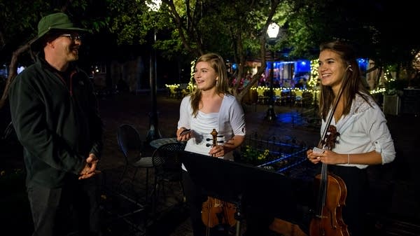 Violists Bethany Hargreaves and Chloe Thominet busking on the streets of downtown Aspen, Colorado.